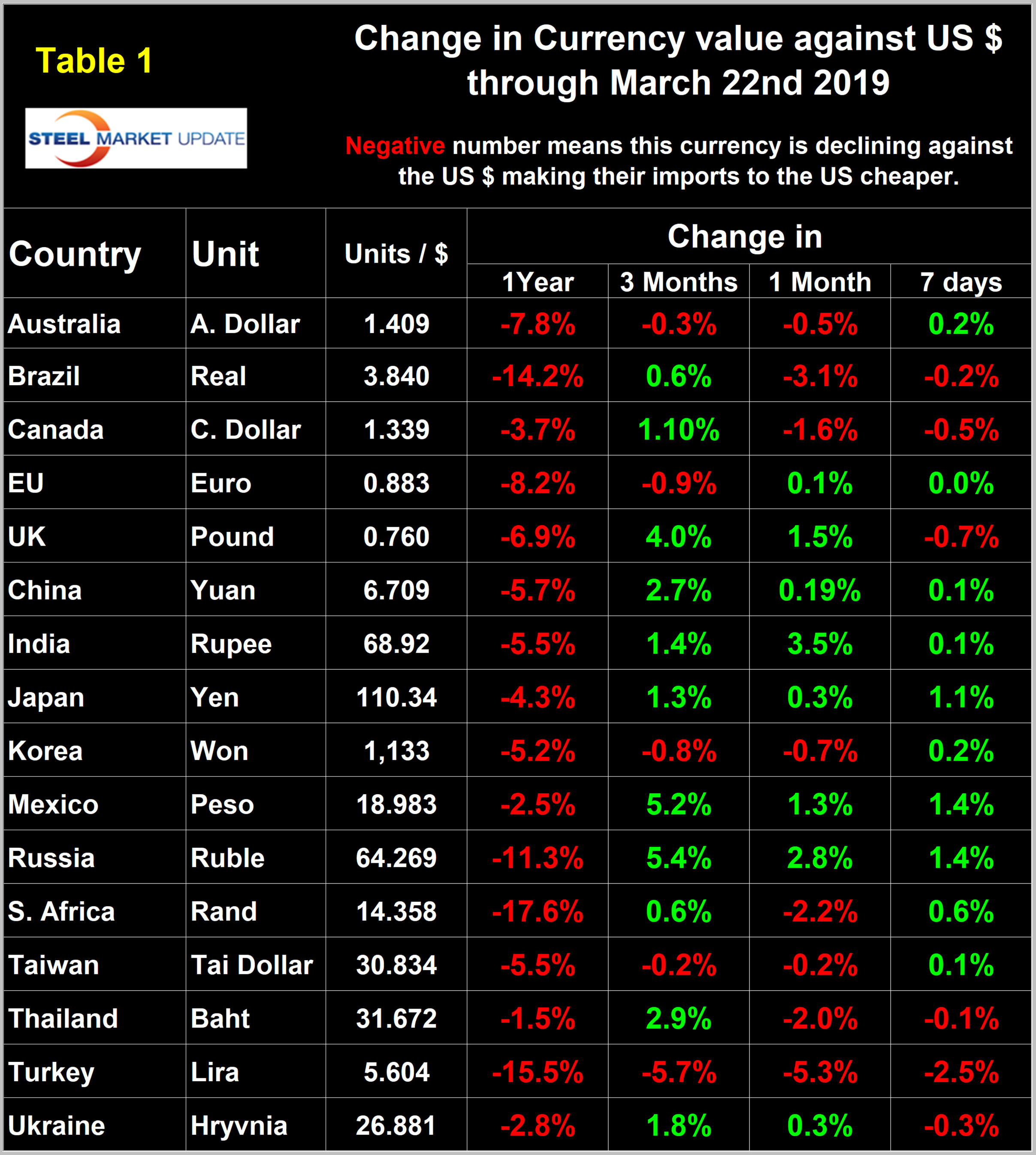 Each month, SMU publishes an update of Table 1, which shows the value of the U.S. dollar against the currencies of 16 major global steel and iron ore trading nations. The table shows the change in value in one year, three months, one month and seven days through Feb. 13. Currencies that weakened against the U.S. dollar are color coded in red. Green indicates currencies that strengthened against the U.S. dollar.