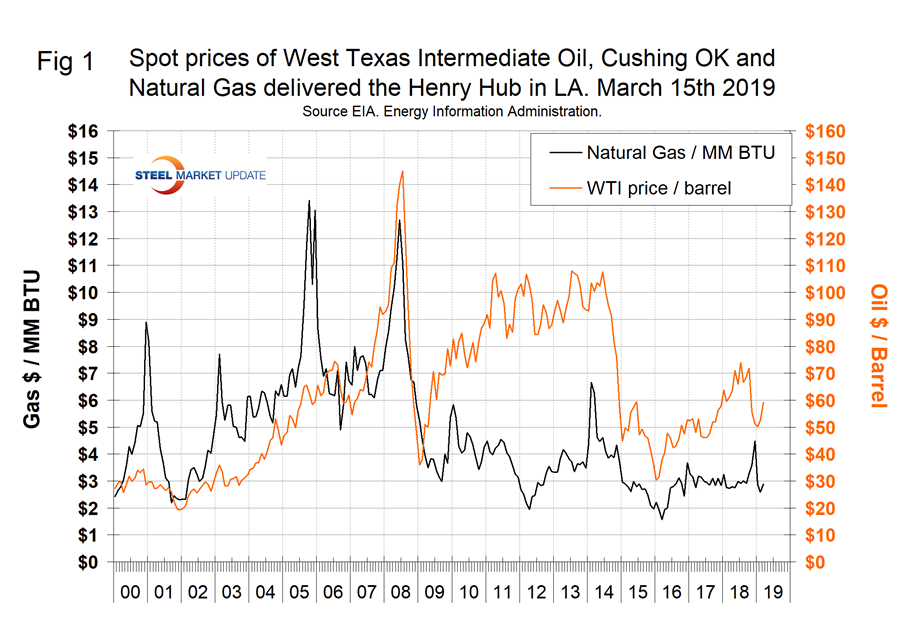 Figure 1 shows historical oil and gas prices from January 2000 through March 15, 2019. Our price and inventory data come from the EIA (Energy Information Administration). On March 15, the WTI priced in Cushing, Okla., was $59.09/barrel and on the same date natural gas at the Henry Hub in Oklahoma was priced at $2.859/MMBtu.