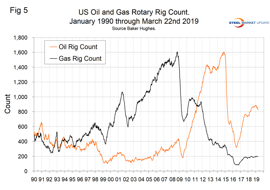 The U.S. gas rig count rose from its low point of 81 on Aug. 5, 2016, to 192 on March 15. The year-over-year growth rate of total U.S. operating rigs was 2.1 percent in the latest data with oil up by 2.5 percent and gas up by 1.1 percent. Figure 5 shows the Baker Hughes U.S. Rotary Rig Counts for oil and gas equipment in the U.S. (explanation below).