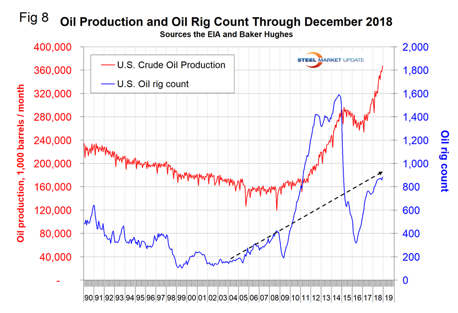 Figure 8 compares oil production and the oil rig count and shows how the increase in exploratory wells drove production from 2009 through late 2014 when the oil price collapsed. The subsequent decline in production was much less marked and is again setting new records. Our take on this is that the huge increase in exploratory oil rigs beginning in 2009 may have been an anomaly and that we won’t see a repeat of the number operating in 2014 for a very long time.