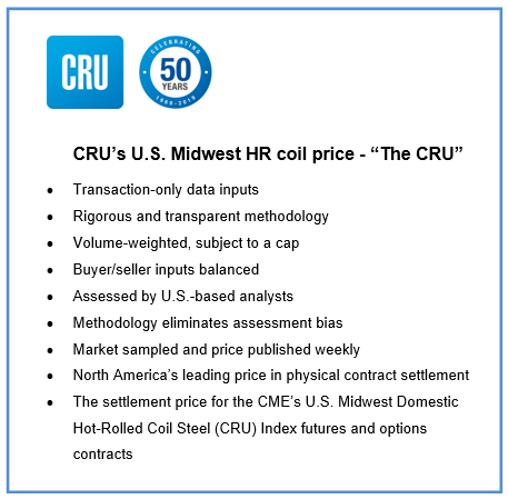 CRU has a long-established and proud history of serving the market with its U.S. Midwest HR coil price or “The CRU” as it has become known. Independent market research, including that concluded very recently, has again established that The CRU is used in the determination of the vast majority of physical index-linked contracts in North America.