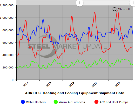 Below is a graph showing the history of total water heater, warm air furnace and air conditioner shipments. You will need to view the graph on our website to use it’s interactive features; you can do so by clicking here. If you need assistance with either logging in or navigating the website, contact info@SteelMarketUpdate.com.