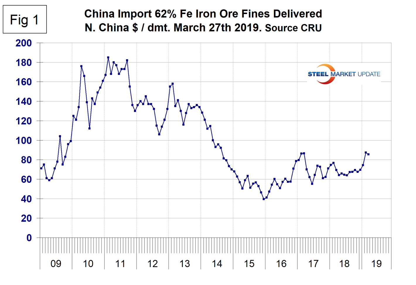 Based on CRU’s data, the weekly average spot price of 62% fines delivered North China was $85.50 per dry metric ton on March 27. The price declined by $1.80 in the last month, but was up in three months and year-over-year. Figure 1 shows the price of 62% Fe delivered North China since January 2009. The price of ore has broken out of the $20 range that prior to February 2019 had existed for a year and a half.