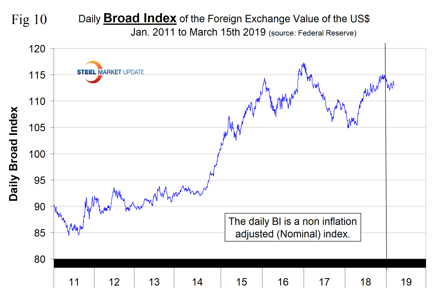 SMU Comment: After appreciating steadily throughout 2018, the dollar has declined in 2019 (Figure 10). There is an inverse relationship between commodity prices and the value of the U.S. dollar on the global currency markets, an example of which is shown for shredded scrap in Figure 6. However, the price of scrap has been completely out of whack for two years now as shown in Figure 11. Long-time subscribers will remember how proud we used to be of our scrap-to-oil relationship that had a correlation of 93 percent for over 25 years. This has also broken down in the last two years, with the scrap price currently being too high. Supply and demand fundamentals are the primary drivers of raw materials prices, but a rising dollar acts as a headwind on the price of those global commodities that are priced in dollars. In the case of scrap, something significant must be occurring below our radar screen. We would love to hear from our scrap industry subscribers on why they think long-term price relationships have broken down.