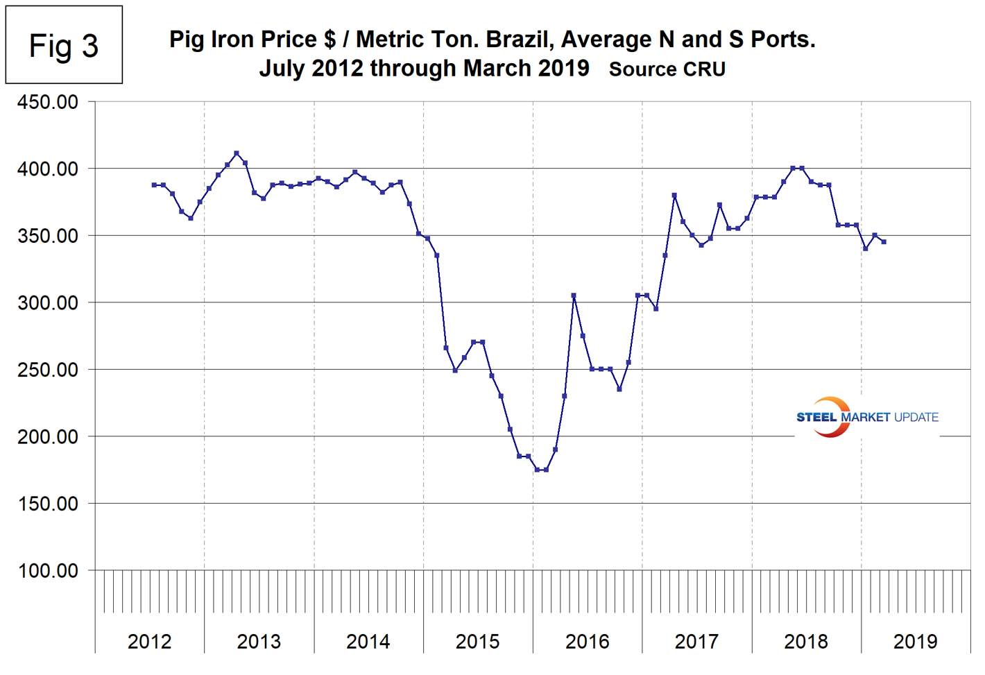 Most of the pig iron imported to the U.S. currently comes from Russia, Ukraine and Brazil with additional material from South Africa and Latvia. In this report, we summarize prices out of Brazil and average the FOB value from the north and south ports. The price steadily increased from the $175 low point in February 2016 to $400 in May and June 2018 before declining to $345 in March 2019. The average price in March was 8.9 percent lower than in March last year (Figure 3).