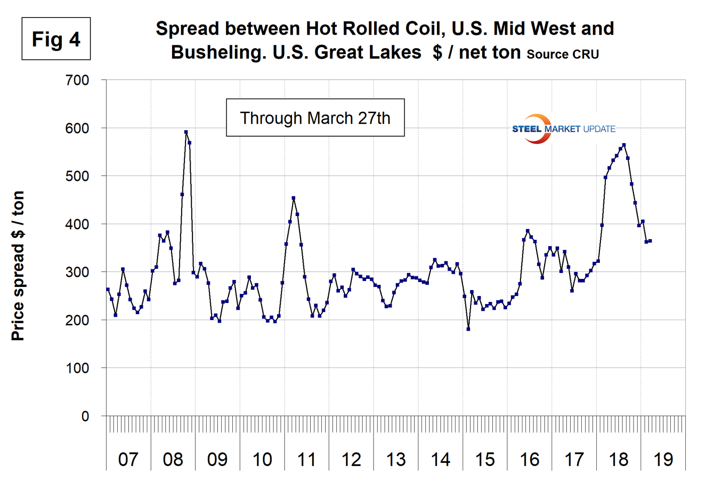 To put this raw materials commentary into perspective, we include here Figure 4, which shows the spread between busheling in the Great Lakes region and hot rolled coil Mid West U.S. through mid-March 2019, both in dollars per net ton. The spread has collapsed from $564 in August last year to $364.18 in March and is approaching a more historically normal range.