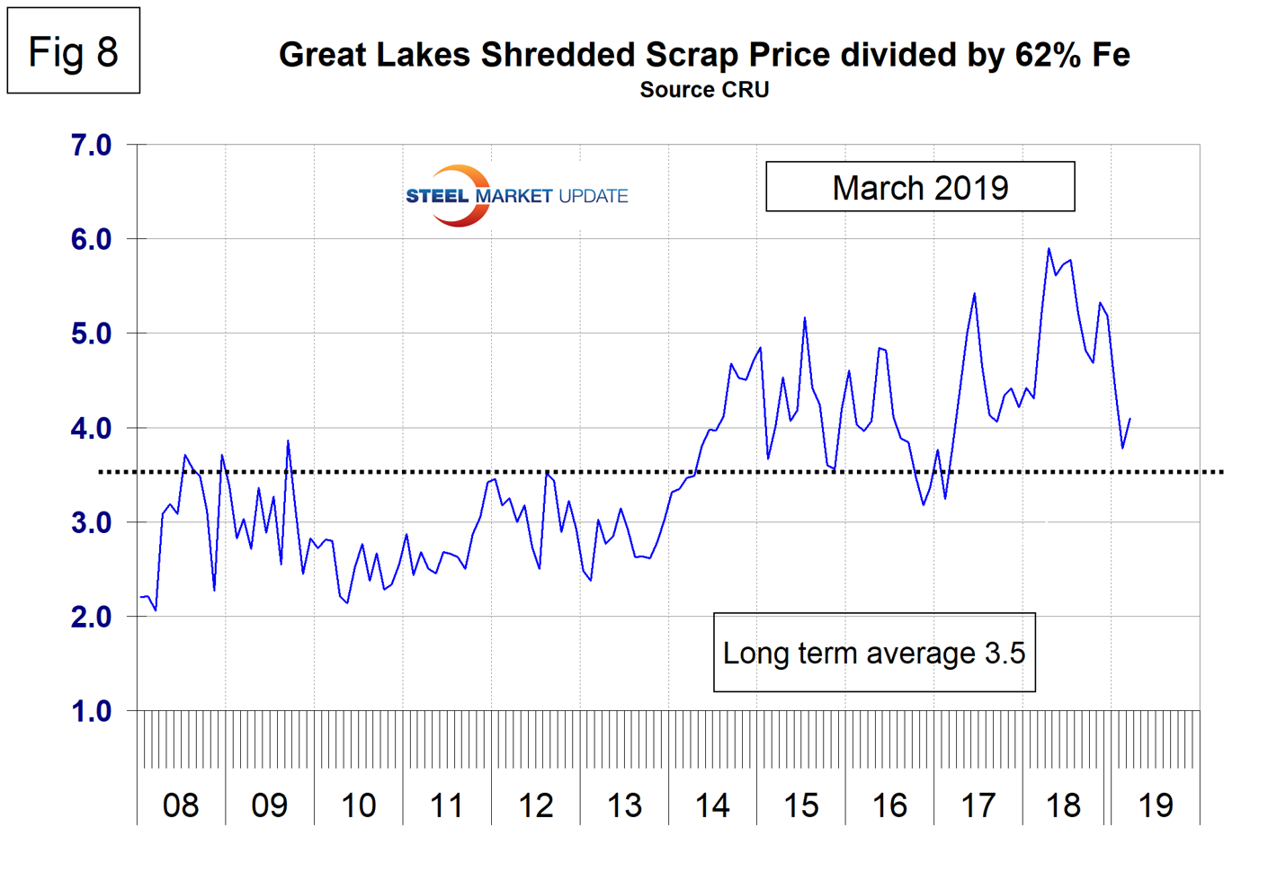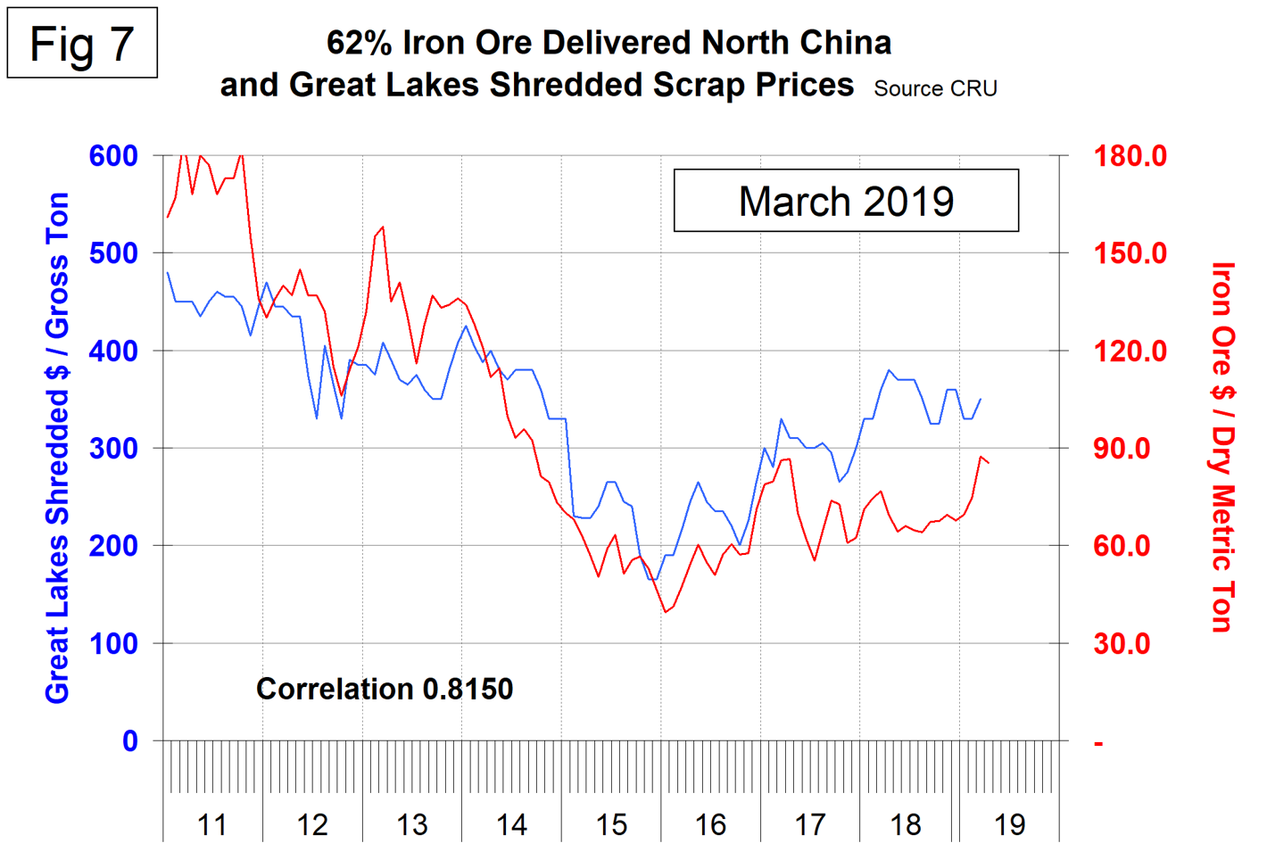 There is a long-term relationship between the prices of iron ore and scrap. Figure 7 shows the prices of 62% iron ore fines delivered N. China and the price of shredded scrap in the Great Lakes region through mid-March 2019. The correlation since January 2006 has been 81.5 percent. There has been a very unusual divergence in these prices since Q2 2017, but that discrepancy seems to be closing.