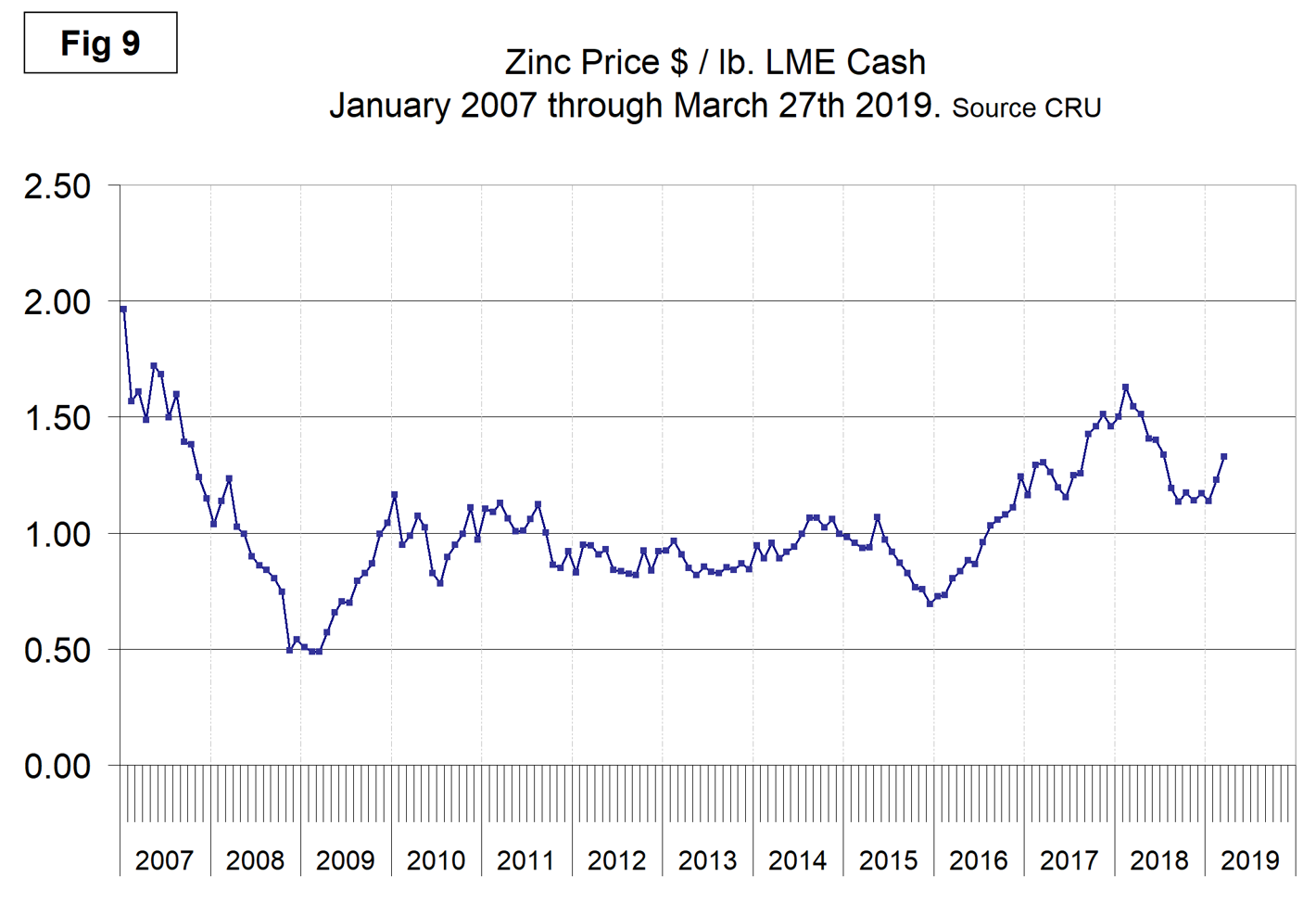 The LME cash price for zinc mid-month is shown in Figure 9. The latest data is for March 27 when the price was $1.33 per pound and breaking out to the upside of a six-month hiatus.