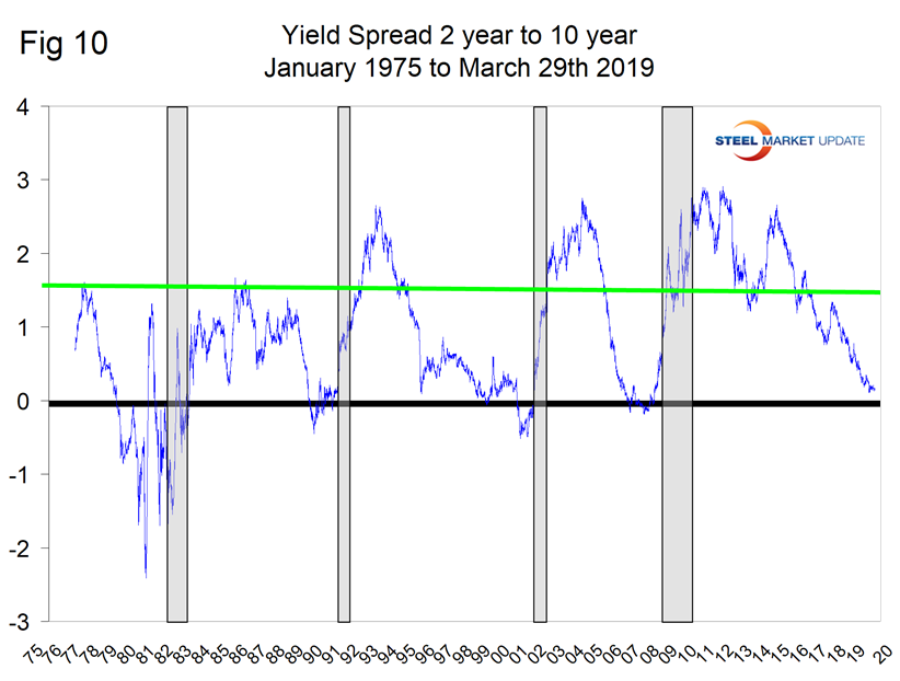 The Treasury spread is developed by subtracting a shorter-term from a longer-term Treasury yield. Ten-year interest rates minus two-year interest rates, for example, as shown in Figure 10. A spread that is increasing is a sign of higher growth and inflation as bank lending becomes more profitable (borrow short and lend long) and loan growth is expected to accelerate. A declining or contracting yield spread foreshadows lower growth and inflation due to contractions in bank loan growth due to reduced profitability. The current forecast predicts lower growth and inflation will materialize in 2019. That thesis has been unfolding as the yield curve is contracting. Prior to the last few weeks, the Fed was signaling that it would raise rates several more times in 2019. This policy is now being re-examined.