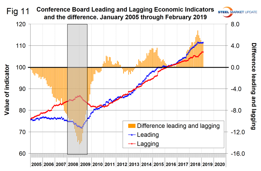 Figure 11 is the chart we like the best, though we have no history before 2008. This is The Conference Board leading and lagging economic index. We have subtracted one from the other in the rationale that if the lead is better than the lag, the situation is improving, or vice versa. The lead minus lag inverted three years in advance of the 2008 recession; certainly by 18 months before the big event it was clear something was happening. The spread began to narrow in October last year with a continuing trend in the following four months.