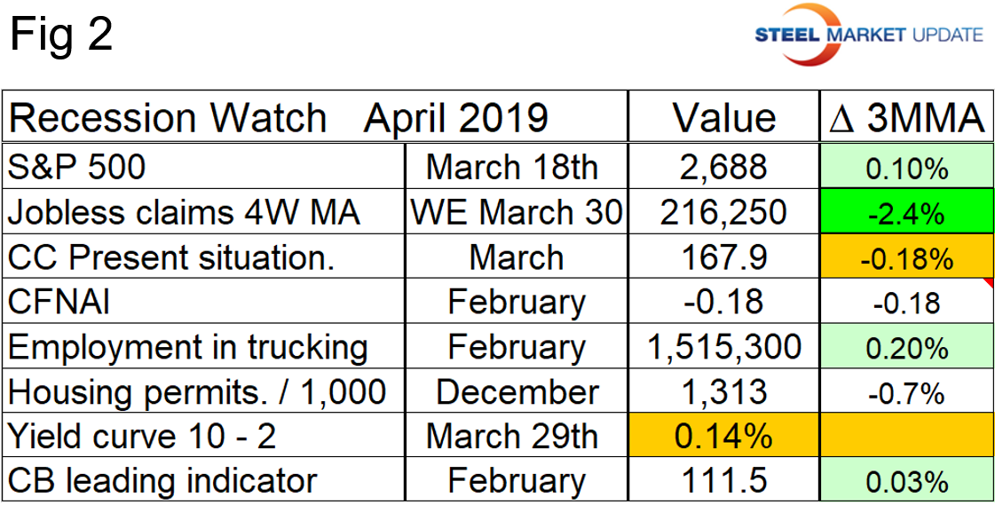Figure 2 is what we describe as a heat map that summarizes the present state of the eight indicators tracked in this analysis. Color codes show the degree of distress of each item. Red, of which there are none today, would indicate a cause for concern. All except the yield spread are reported as changes to the three-month moving average (3MMA). The yield spread is shown as the actual value of the 10-year minus 2-year Treasury interest rates.