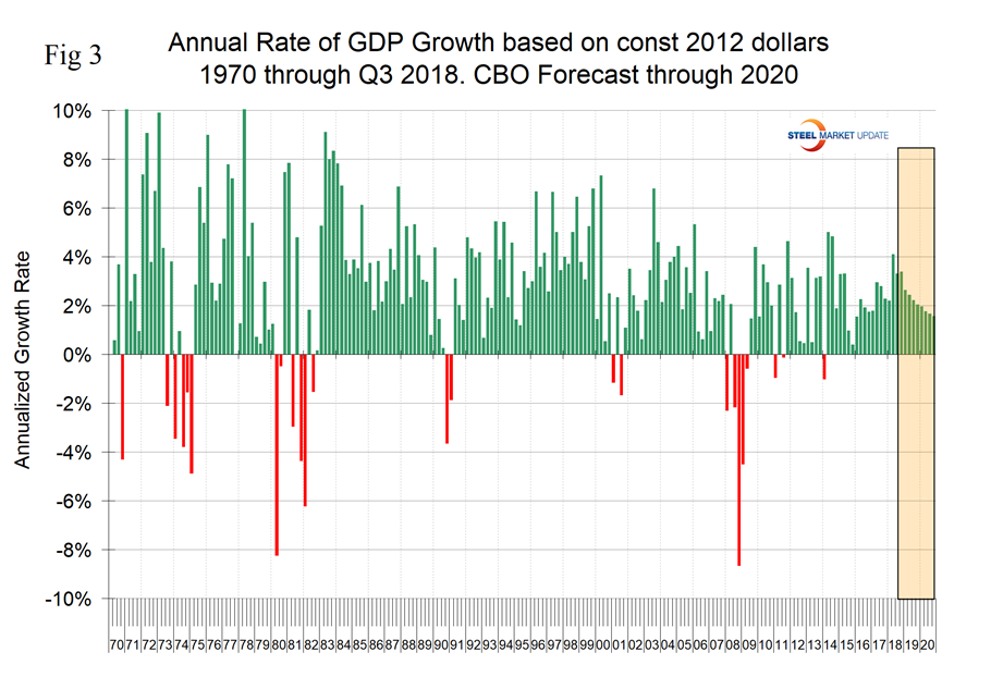 Figure 3 provides a history of U.S. recessions since 1970. Recessions occurred in 1974, 1980, 1981, 1990, 2001 and 2008. In its third estimate of the growth of U.S. GDP for Q4 2018, the BEA reported the growth of GDP to be 2.2 percent. This is a quarter-on-quarter result. On a trailing 12-month basis, GDP grew 2.97 percent in Q4. Congressional Budget Office economists expect economic growth to decline in upcoming quarters, but not to become negative through 2020.