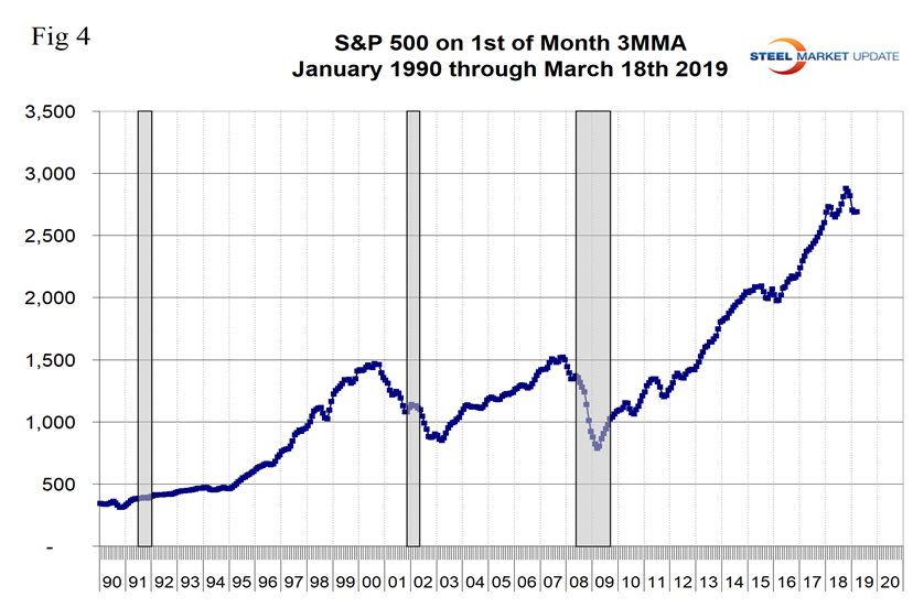 Figure 4 shows the three-month moving average of the S&P 500 at the middle of each month from January 1990 through March 2019. The stock market did predict the recession of 2001, but failed in 2008. Since then there have been several blips that proved of no significance. The tendency is that stock prices decline as investors anticipate a weakening economy and flagging corporate earnings. Fed tightening is also a factor in today’s world.