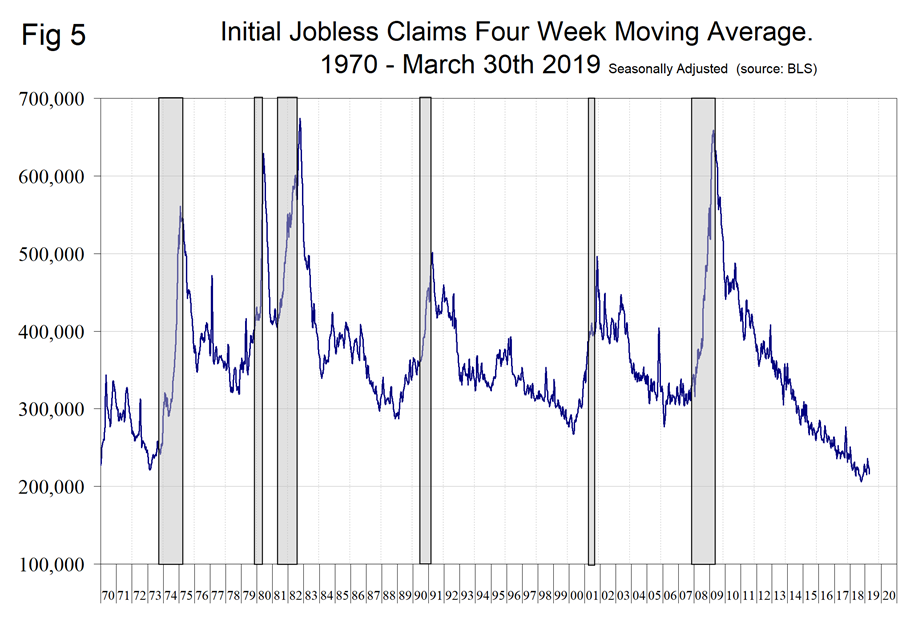 Figure 5 records new weekly claims for unemployment compensation. This indicator failed to predict the 1981 and 2008 recessions. It had a lead of over a year on the other four. Initial claims for unemployment insurance, reported weekly, are a sensitive measure of layoffs. Initial claims were at a 50-year low at the end of 2018, but there has been a recent blip resulting from the government shutdown.