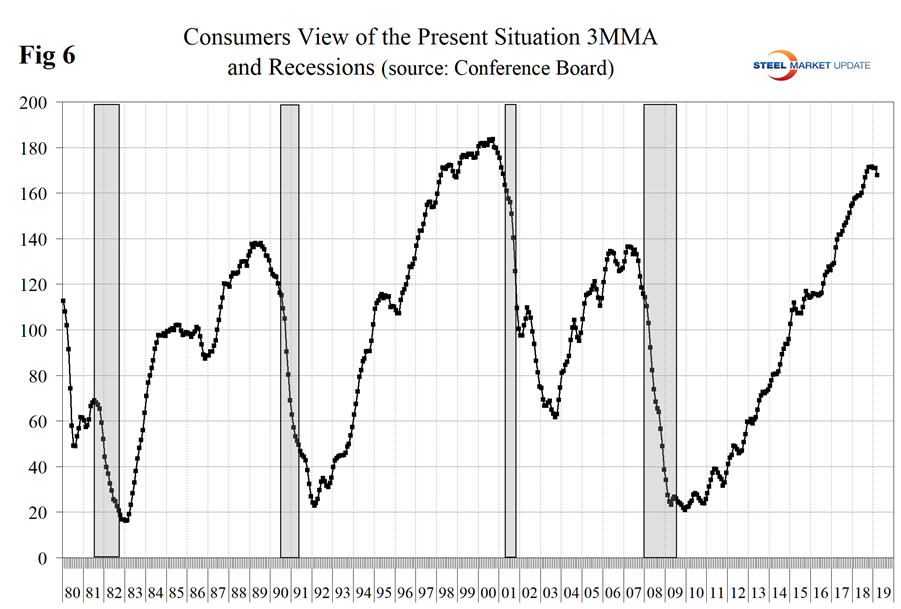 Consumer Confidence: When consumers, businesses and investors lose confidence, it sets up a downward self-reinforcing spiral of reduced spending and investment, causing even higher unemployment, and further depressing confidence. Consumer confidence is reported as sentiment indexes of the present situation and expectations, and a composite of the two. It appears that the consumer’s view of the present situation is the best predictor of future recessions and this is shown in Figure 6. We believe that the latest CC data was adversely affected by the government shutdown.