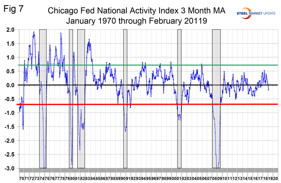 Since our data stream began in January 1970, the CFNAI has predicted every recession, but in-between there have been stumbles and false alarms (Figure 7).