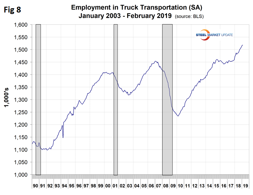 Employment in Trucking: Figure 8 shows total truck driver employment as reported monthly by the BEA. As a measure of economic activity, this indicator has predicted the last three recessions and at present is showing no sign of a slowdown.