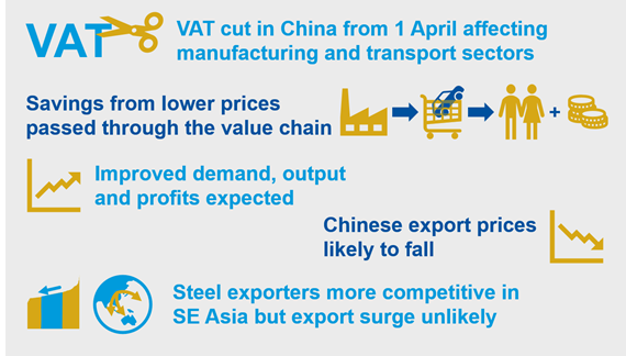 Why have domestic prices risen in reality? While the VAT cut implies prices are lower than they would otherwise have been, ex-warehouse prices increased in the first week of April – why? Firstly, underlying demand has improved, including in the infrastructure sector and with some seasonal demand improvement in construction activity. This has, in turn, meant inventories are lower. Sentiment has also been buoyed by the cut in VAT, with the promise (see below) but not yet reality of improved demand from machinery, transport and other mainly flat product-consuming sectors. At the same time, some mills are still undertaking maintenance in April, a view confirmed recently by CRU analysts who were present at CISA’s 17th International Steel Market and Trade Conference in Nanjing.