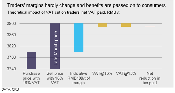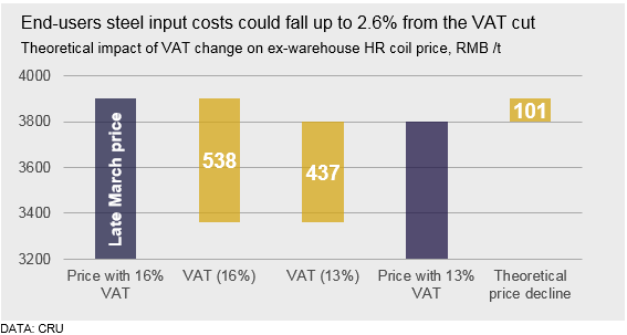 The price of steel is therefore reduced by up to the full extent of the change in VAT to the next firm in the supply chain. This is illustrated in the example case of a Chinese domestic stockholder chart below, but equally applies for a mill-direct sale to an end-user, or mill to stockholder sale. In this case, using end-March ex-warehouse prices, the maximum theoretical price reduction that could be attributed to the VAT change in isolation is around 2.6 percent or RMB100 /t ($15 /t), assuming that the stockholder passes on the full saving to their customers.