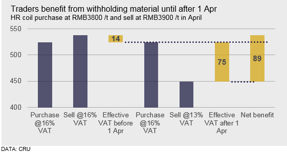 One-off win for some traders and stockholders: Some stockholders and traders have sought to benefit from this mechanism by withholding sales of material purchased before April 1 until April or later. This allows for reclamation of VAT on input materials at the 16 percent rate, but payment of VAT at only 13 percent on their sales, effectively boosting margins. This, where seen, created short-term ex-warehouse price support due to artificially-limited supply and some volatility in the second half of March.