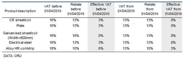 Wide HDG coil is an exception, as there was formerly a full (16 percent) rebate, and this is still the case (a full 13 percent rebate), meaning the effective VAT of 0 percent remains unchanged. Therefore, HDG coil export prices would not, in theory, change due to the VAT rate change.