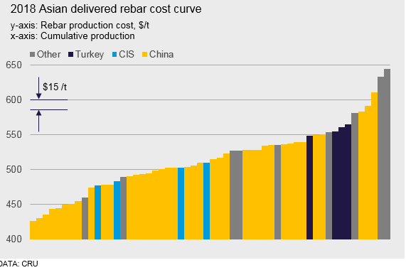 Does this give China a competitiveness boost? Yes, by up to $15 /t. However, this is not transformative in the sense that this would bring a large incremental volume of new competitive Chinese supply to the market, and the delivered Southeast Asia cost gap with other potential suppliers is much greater – the gap between the highest cost Chinese and CIS-origin rebar supply is around $100 /t by comparison as shown in the chart below. On the other hand, marginal supply from Turkey, as was seen in late 2018 and early 2019, can be more easily fended off. Without a commensurate relative fall in scrap vs. hot metal costs, Turkish steel will have a much more difficult or impossible task in penetrating Asian markets, especially in times of Chinese domestic market weakness.
