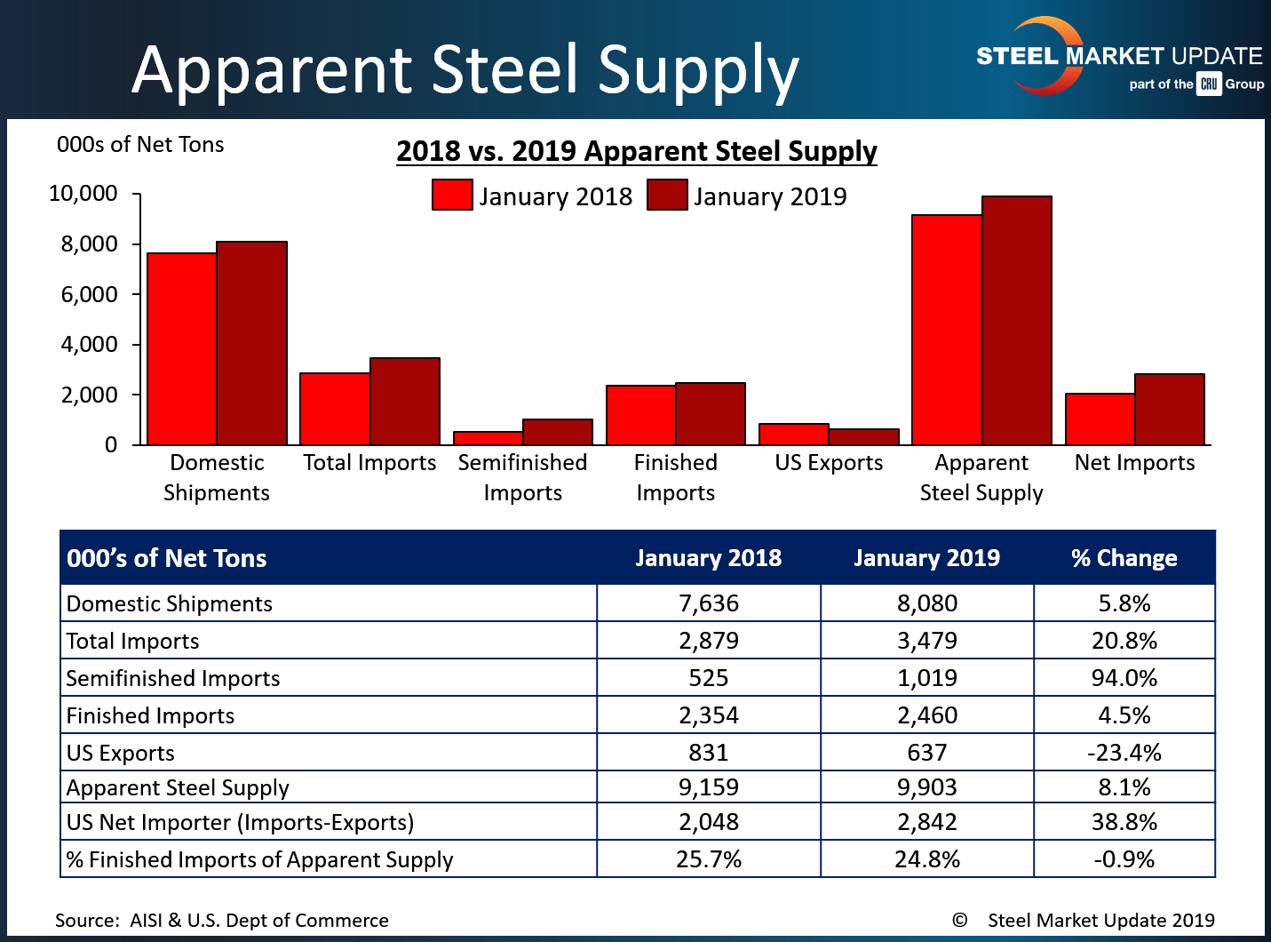 January apparent steel supply saw a 744,143 ton or 8.1 percent increase compared to the same month one year ago. This change was primarily due to an increase in domestic shipments of 443,436 tons or 5.8 percent, followed by a decrease in total exports of 194,617 tons or 23.4 percent and an increase in finished imports of 106,090 tons or 4.5 percent.