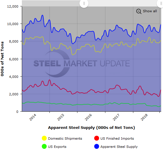 To see an interactive graphic of our Apparent Steel Supply history (example below), visit the Apparent Steel Supply page in the Analysis section of the SMU website. If you need any assistance logging in or navigating the website, contact us at info@SteelMarketUpdate.com or 800-432-3475.