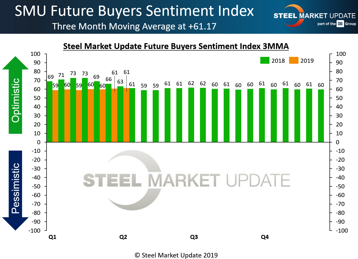 Data in Steel Market Update’s Steel Buyers Sentiment Index were slightly more optimistic this week, though comments from respondents reflect concerns in the market about trade issues, steel demand and the economy. We also continue to see Current Sentiment as being less optimistic than at this time one year ago. However, our Future Sentiment Index is now on par with what we saw at this time last year.