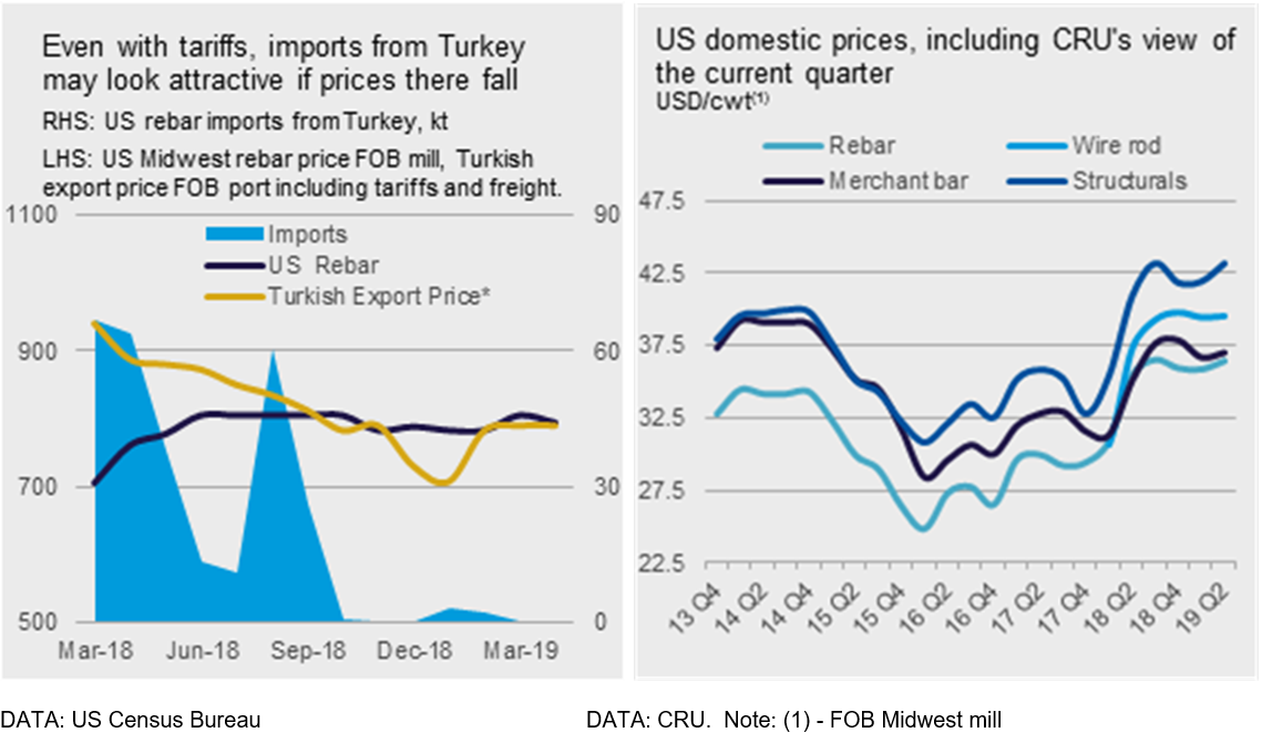 Competitive import offers have also affected rebar prices. Mills that increased prices by $1.00/cwt have met limited success in some instances as import offers came in near $34.00/cwt loaded truck in the Gulf Coast. March import volumes nearly tripled from the prior month to 95,700t, the bulk of which arrived from Europe. Market participants said that Turkish exporters are becoming more aggressive with offers amid a declining lira, with some offers as low as $705/t ($32.00/cwt). These offers may result in imports arriving from Turkey despite a tariff of more than 50 percent being currently in place.