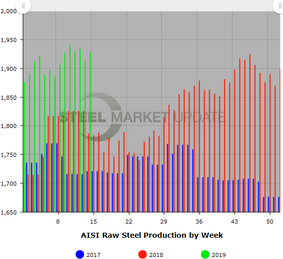 U.S. raw steel production for the week ending April 6 increased by 0.8 percent from the previous week to 1,928,000 net tons, while the mill capability utilization rate inched up by about a half percentage point to 82.8 percent. The week’s production represented a 7.9 percent increase from the same period last year, reported the American Iron and Steel Institute.
