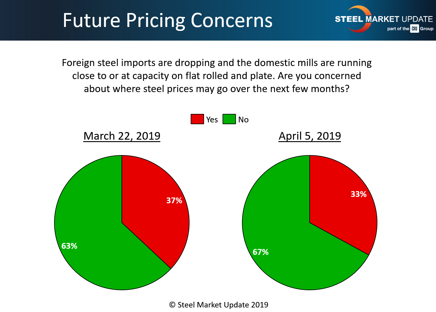 Steel Market Update asked: “Foreign steel imports are dropping and the domestic mills are running close to or at capacity on flat rolled and plate. Are you concerned about where steel prices may go over the next few months?” In the final tally, just 33 percent indicated they are anxious about steel prices.