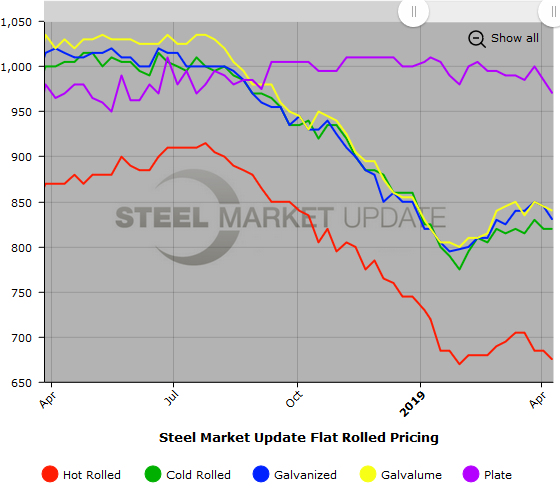 SMU Note: Below is a graphic showing our hot rolled, cold rolled, galvanized, Galvalume and plate price history. This data is available here on our website with our interactive pricing tool. Note that plate prices are not yet available on our website, but we are in the process of adding that dataset. If you need help navigating the website or need to know your login information, contact us at info@SteelMarketUpdate.com or 800-432-3475.