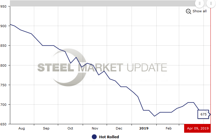 If you go back to the graphic above and look at the red bars and then compare the pricing graphic below (you can get an even longer view by clicking on this link to our website – must login to access data) you can view the relationship between our service center spot and the impact on mill spot numbers. HRC prices bottomed on Jan. 29, 2019, at $670 per ton. With the price announcements by the domestic mills, the spot mill price average improved by $35 per ton to $705 per ton (March 12 and March 19). Since then support has slid and the numbers have dropped to the current level of $675 per ton average ($650-$700 range).