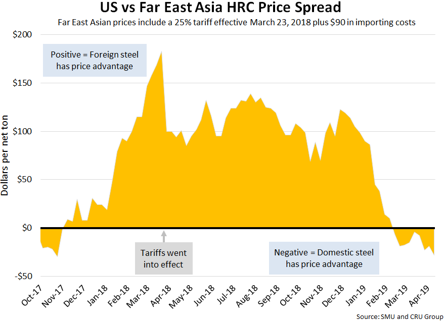 SMU now includes a 25 percent import tariff in our foreign vs. domestic price calculations, effective on foreign prices after March 23, 2018. We then add $90 per ton to the foreign prices in consideration of freight costs, handling, trader margin, etc. This provides an approximate “CIF U.S. ports price” that can then be compared against the SMU U.S. hot rolled price. The difference between the domestic and foreign hot rolled prices is then referred to as the “price spread.” As the price spread narrows, the competitiveness of imported steel into the United States is reduced. If the spread widens, then foreign steel becomes more attractive to U.S. flat rolled steel buyers. A positive spread means foreign steel has a price advantage (U.S. prices are higher than foreign prices), while a negative spread means domestic steel has a price advantage (U.S. prices are less than foreign prices). Note that we do not include any anti-dumping (AD) or countervailing duties (CVD) in this analysis.