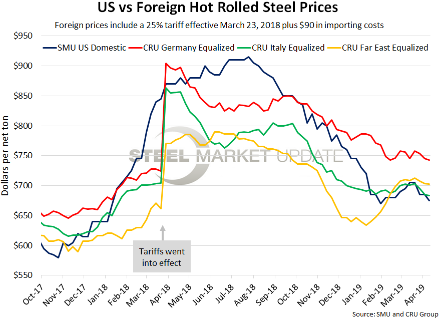The graph below shows all four prices together and points out the effective date of the tariffs. Foreign prices are referred to as “equalized,” meaning they have been adjusted with the tariffs and importing costs for an apples-to-apples comparison against the U.S. price.