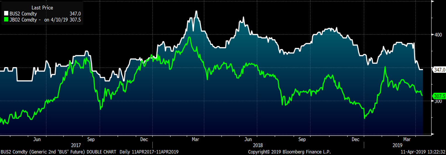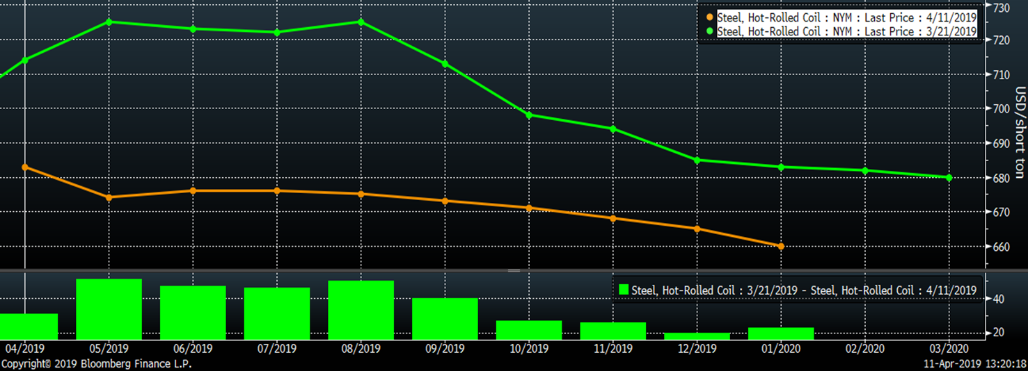 However, scrap prices have diverged from iron ore with 2nd month busheling falling to the lowest level since November 2017, settling last night at $347/lt, while 2nd month LME Turkish scrap has also continued to fall since its post Brazilian dam break peak in mid-February, settling today at $307.50/t.