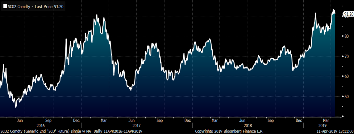 The 2nd month SGX iron ore future settled at a multi-year high last week before settling today at $91.20t.