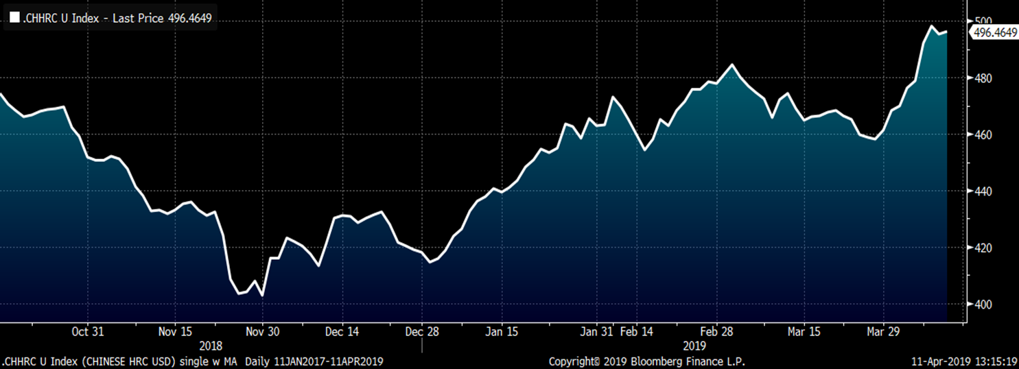 The (most active) October Shanghai Futures Exchange Chinese HRC future has traded higher along with iron ore settling today at $496.50 USD/st.