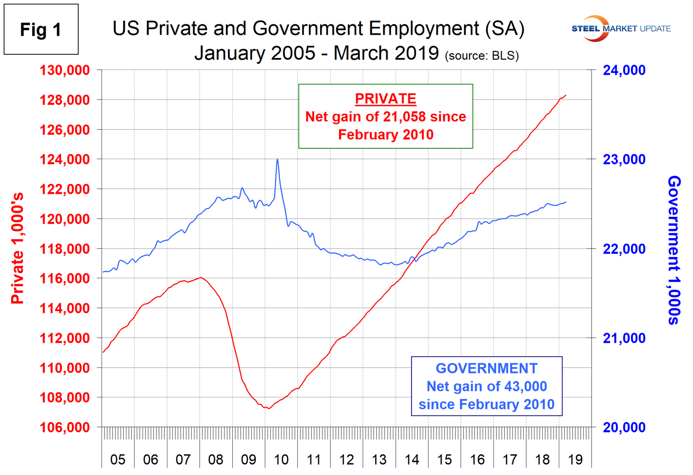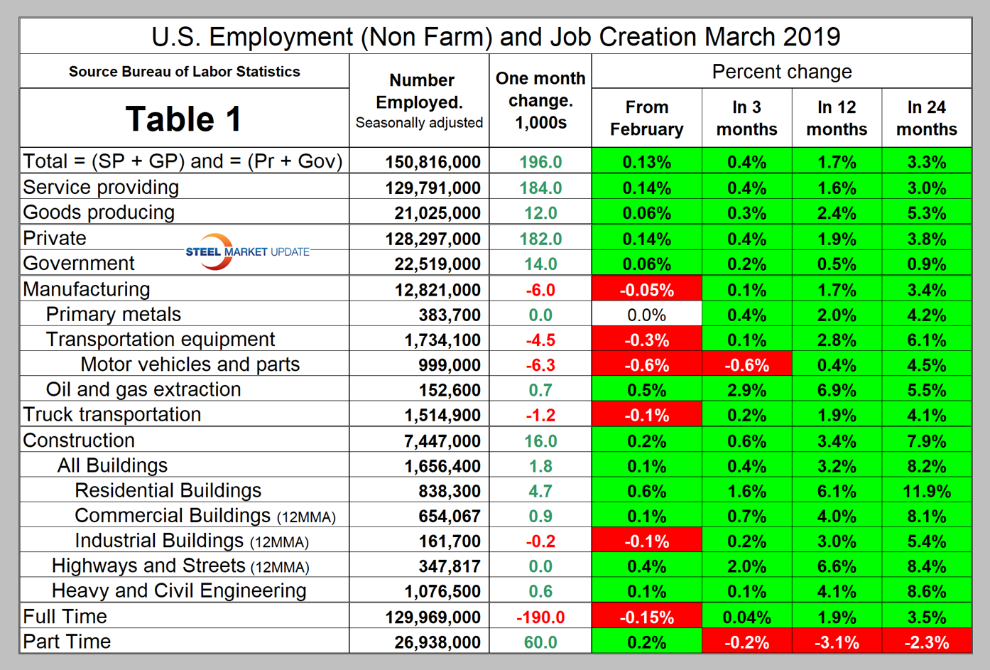 In March, 182,000 jobs were created in the private sector and government added 14,000, reports the Bureau of Labor Statistics. Table 1 breaks total employment down into service and goods-producing industries and then into private and government employees. Most of the goods-producing employees work in manufacturing and construction and the components of these two sectors of most relevance to steel people are broken out in Table 1.