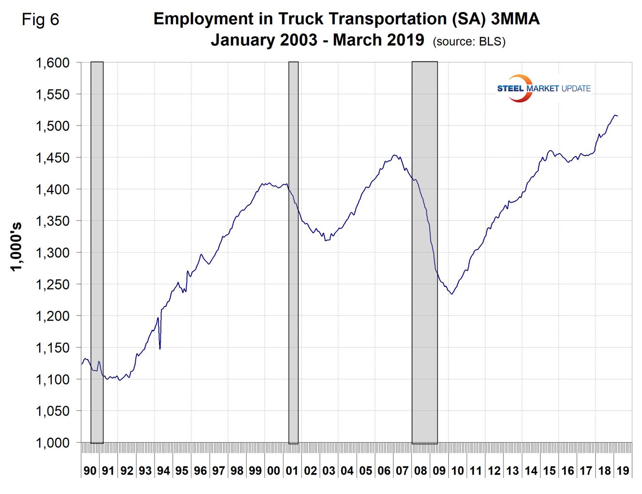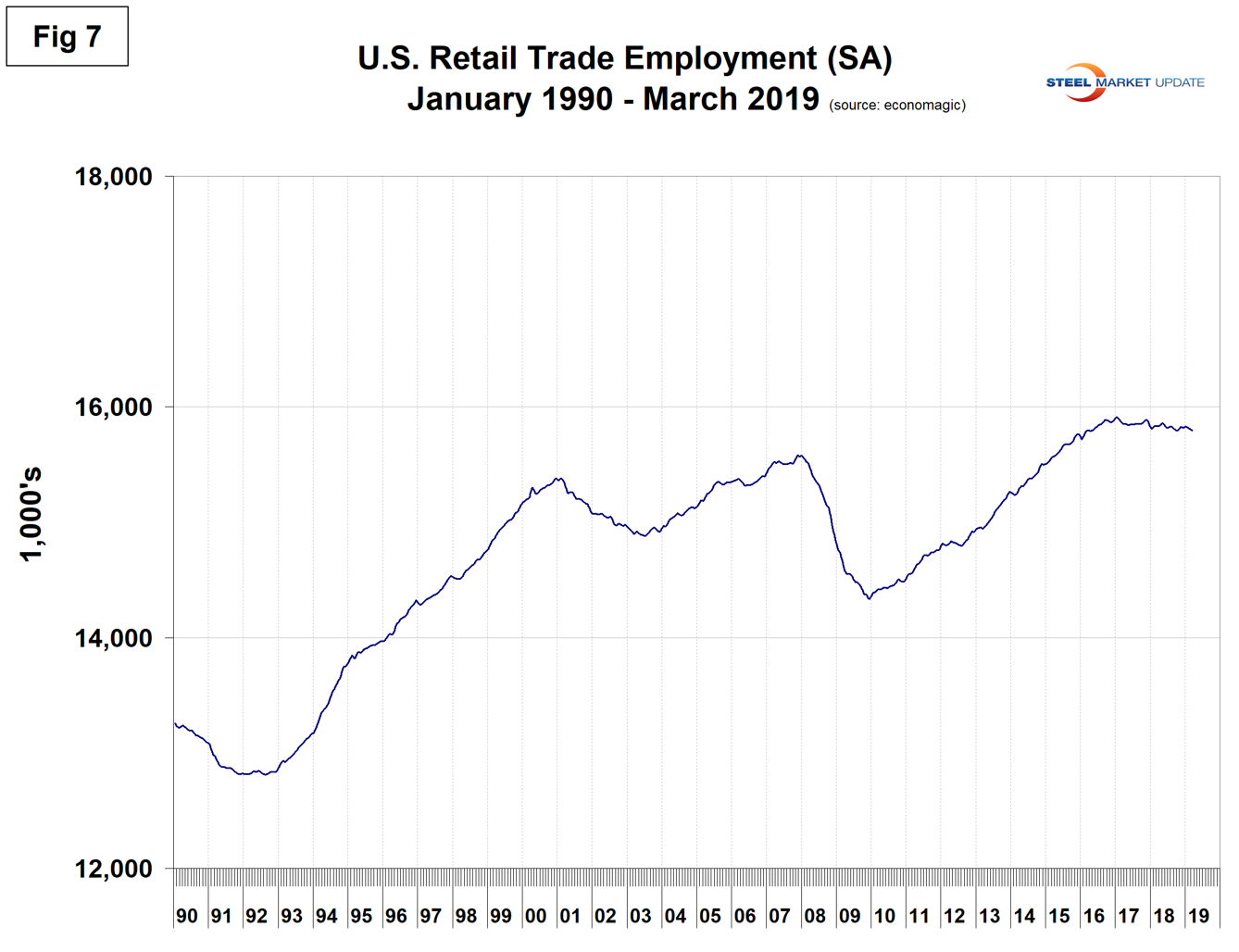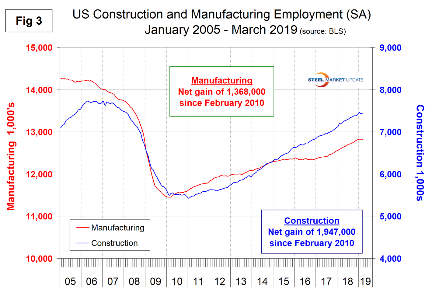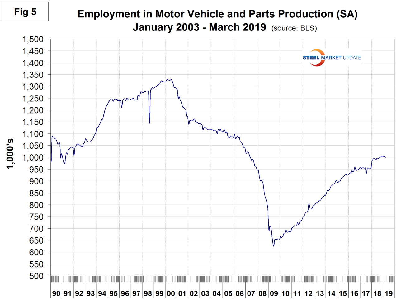SMU Comment: The March employment report showed the February result to be a statistical anomaly. Manufacturing employment growth in March was disappointing, but it will be a couple more months before any trend is revealed. Manufacturing and construction had solid employment gains last year, which bodes well for steel consumption in at least the first half of 2019.