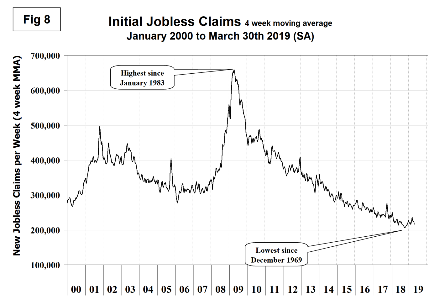 Initial claims for unemployment insurance, reported weekly by the Department of Labor, have decreased in five of the six weeks prior to March 30 on a four-week moving average. New claims in September were at the lowest level since 1969. The U.S. is enjoying the longest streak since 1973 of initial claims below 300,000 (Figure 8).
