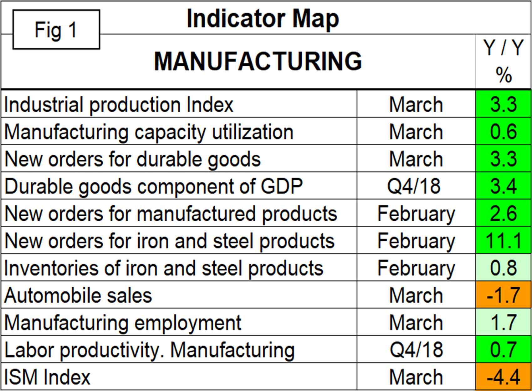 Figure 1 summarizes the 11 individual data streams. All indicators except automobile sales and the ISM Index have positive growth on a year-over-year basis. However, growth rates of some indicators are slowing.