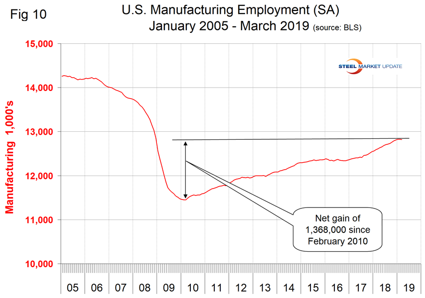 Manufacturing employment plummeted during the recession and gradually improved from the spring of 2010 through 2014. Growth was flat in 2015 and declined slightly in 2016 when 23,000 jobs were lost during the year as a whole. There was a turnaround in 2017 and in the 12 months April 2018 through March 2019, 209,000 manufacturing jobs were created (Figure 10). The motor vehicles and parts subcomponent of manufacturing employment had a net gain of only 4,000 in the same time frame.