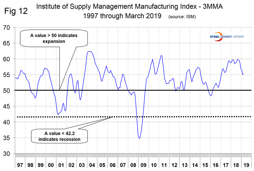 The Institute for Supply Management’s Manufacturing Index is a diffusion index. ISM states: “Diffusion indexes have the properties of leading indicators and are convenient summary measures showing the prevailing direction of change and the scope of change. An index value above 50 indicates that the manufacturing economy is generally expanding; below 50 indicates the opposite.” Figure 12 shows the 3MMA of the ISM index from January 1997 through March 2019. The index surged from January 2016 through October 2017, but declined every month since September through February with a small increase in March 2019. The 3MMA of the index in March was 55.37, down from 59.87 in August and down by 4.37 percent year over year.