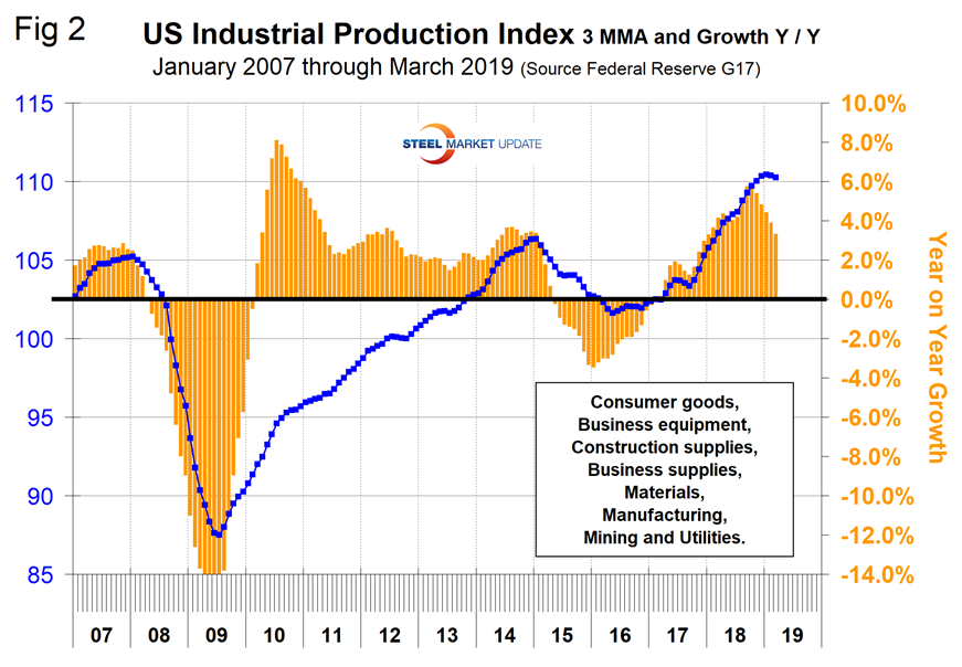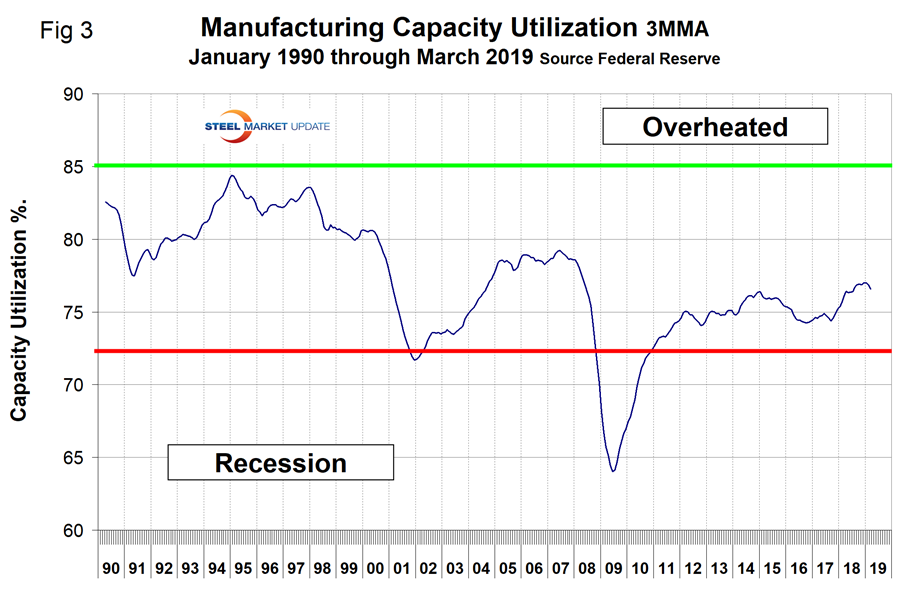 Figure 2 shows the three-month moving average (3MMA) of the IP index since January 2007 as the blue line and the year-over-year growth as the brown bars. March 2017 was the first month of positive growth in the 3MMA since April 2015. Growth has been above 3 percent every month since November 2017, reaching 5.1 percent in October 2018 before declining to 3.3 percent in March. Manufacturing capacity utilization improved from 74.48 percent in January 2017 to 76.56 percent in March 2019, also on a 3MMA basis (Figure 3).
