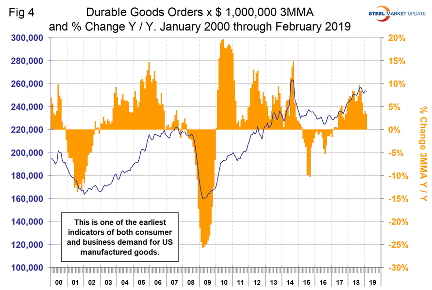 New orders for manufactured durable goods in February were up by 3.3 percent year over year, which was a decline from a 9.7 percent growth rate in September last year. Figure 4 shows the 3MMA since January 2010.