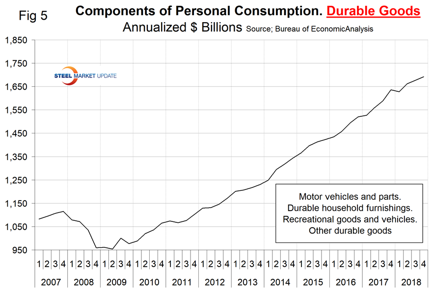 The third estimate of Q4 2018 GDP growth was reported as 2.2 percent annualized, which was down from 4.2 percent in the second quarter. A subcomponent of the quarterly data is durable goods, which is part of the personal consumption calculation. It therefore contains no military hardware or civil aircraft data. This is shown in Figure 5 and, presumably because of the exclusions just mentioned, looks nothing like the blue line in Figure 4. The durable goods portion of GDP declined in Q1 2018, but the long-term trend is still very positive.
