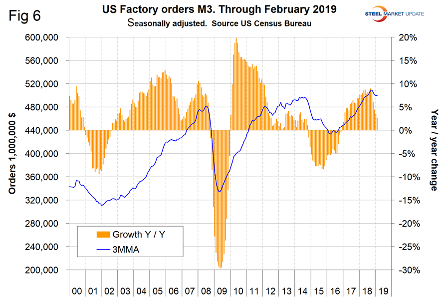 New orders for manufactured products as reported by the Census Bureau declined every month October through February on a 3MMA basis. In February, the year-over-year growth was 2.6 percent, down from 9.0 percent in September (Figure 6).