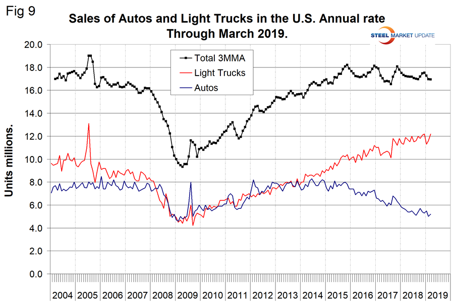 Automobile sales have trended down slightly in the last three years as measured by the cyclical peaks. Year over year on a 3MMA basis, sales were down by 1.7 percent. Sales in March totaled 17.5 million units annualized and were comprised of 70.1 percent light trucks and 29.9 percent autos. The declining sale of autos in the last three years has resulted in GM announcing its intent to close several small car plants. The light truck category includes SUVs and crossovers. Overall, sales are still higher than the pre-recession level (Figure 9). Import market share in March was 22.3 percent and has been drifting up since early 2015.